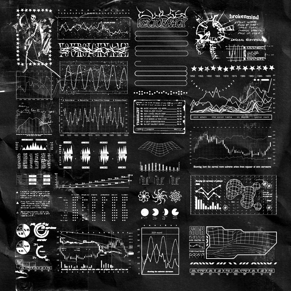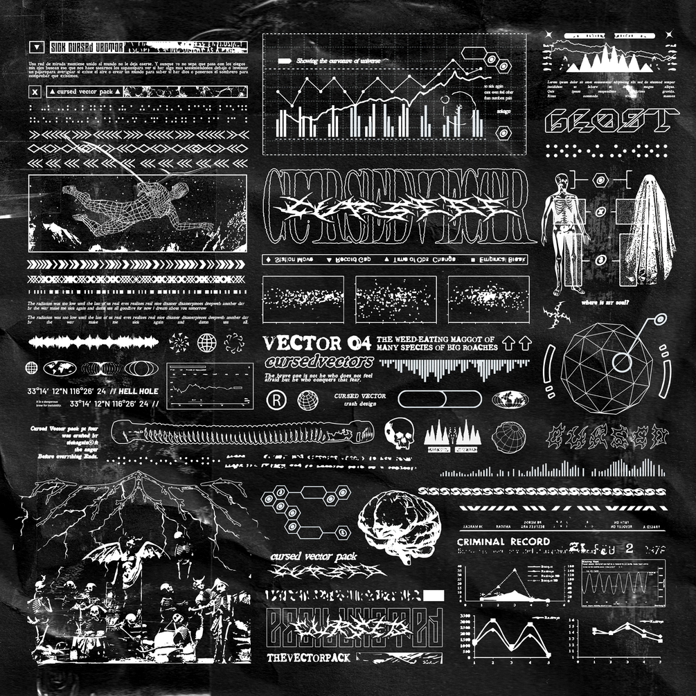 tired of the same old vectors? wanna be cool but everybody uses the same assets that you? well NO MORE! with this SICK CURSED VECTOR PACK you can ALWAYS make your desings UNIQUE! use the pre-made designs or combine the vectors to make NEW designs and easily edit them to make them fit your layout and project requirements!
