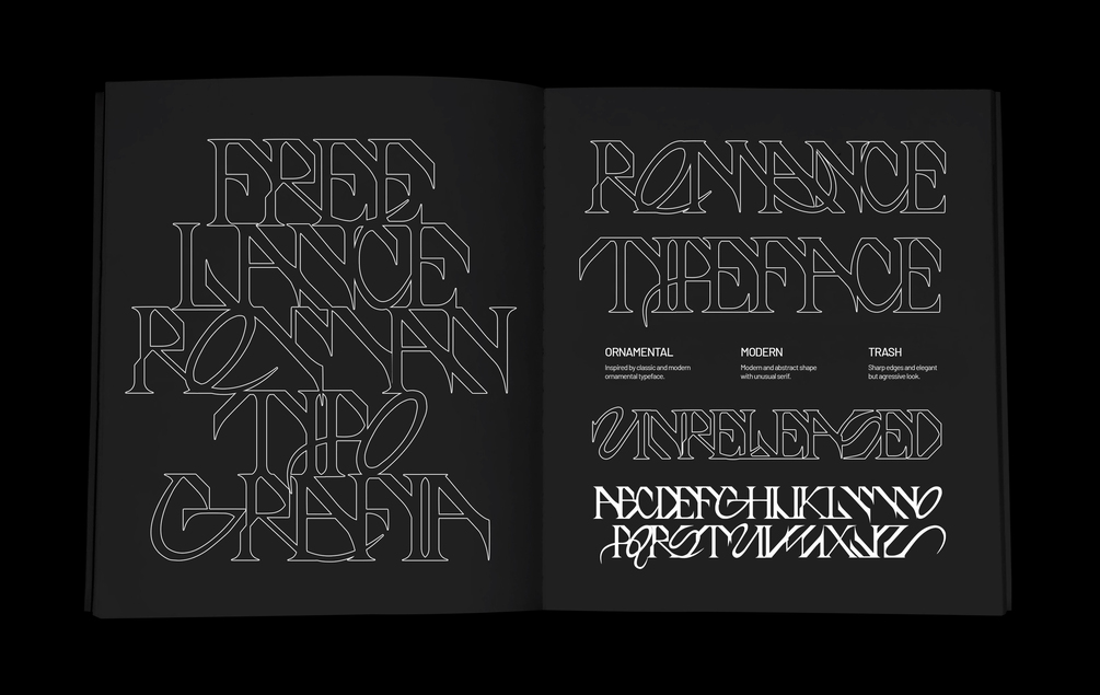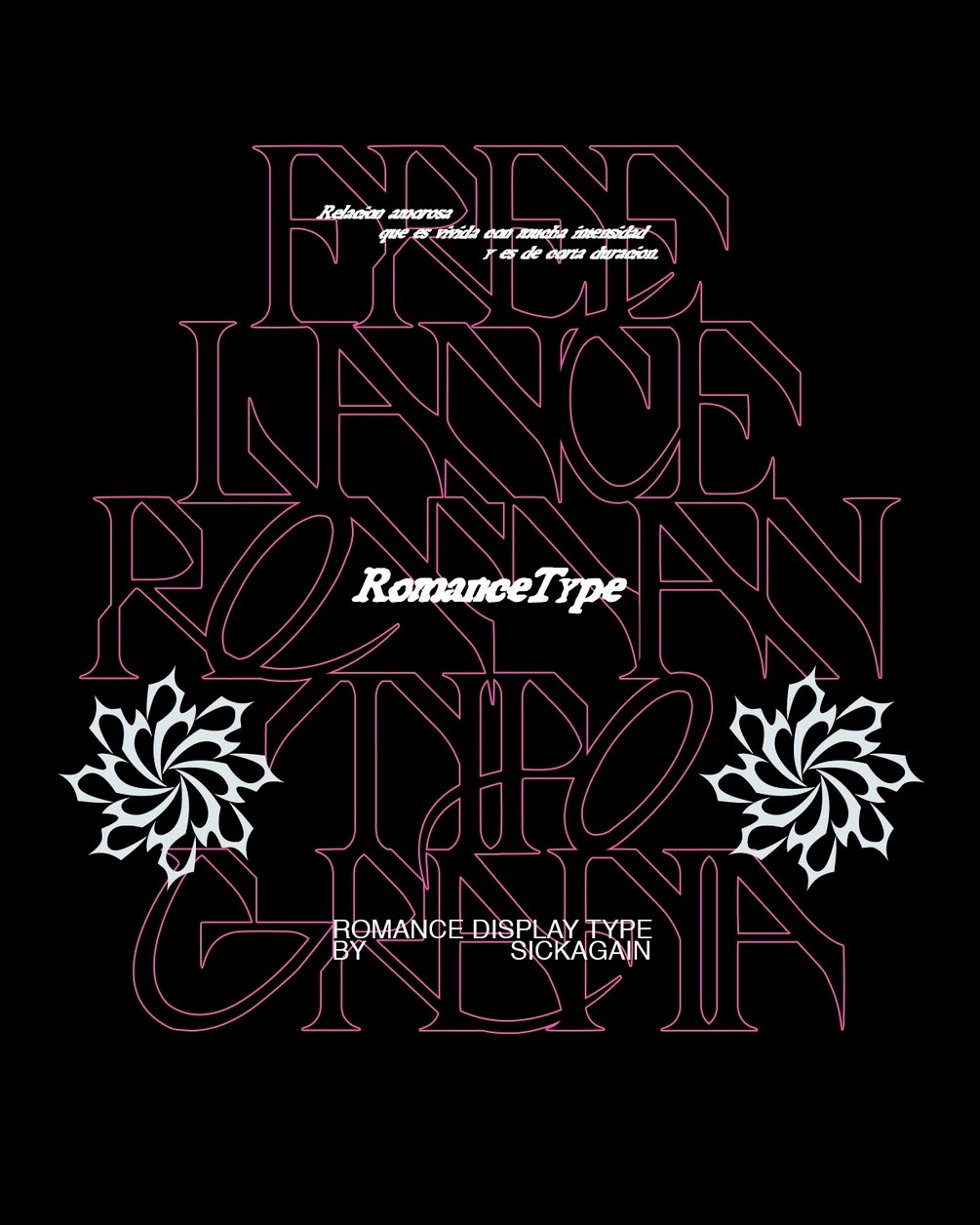 ROMANCE TYPE is a font inspired by classical Roman fonts with modern ornamental strokes and unusual serifs, abrupt diagonals and curves that contrast with the rigid shapes, thus giving visual variety.