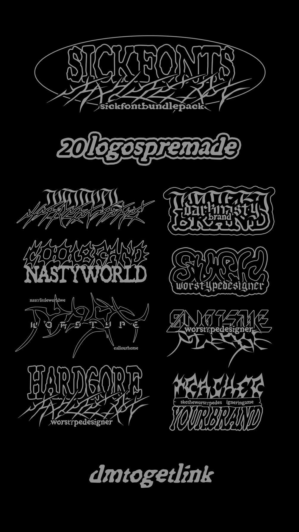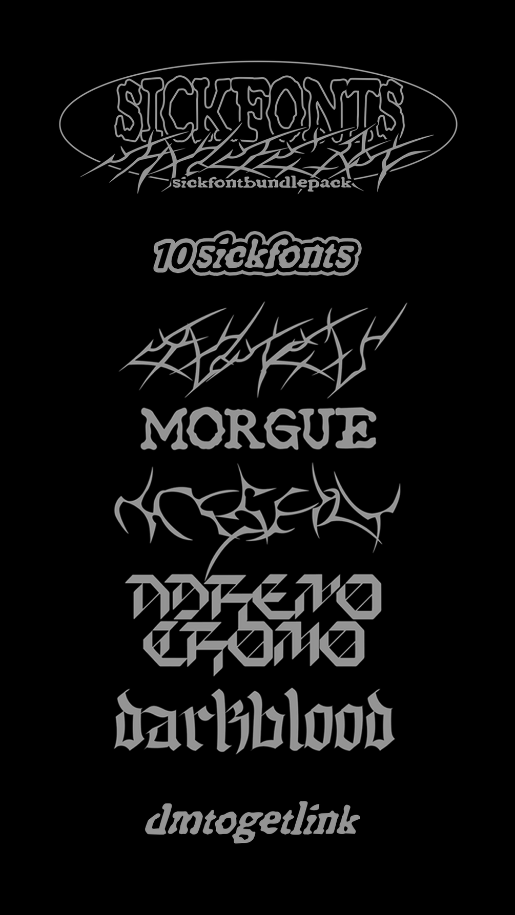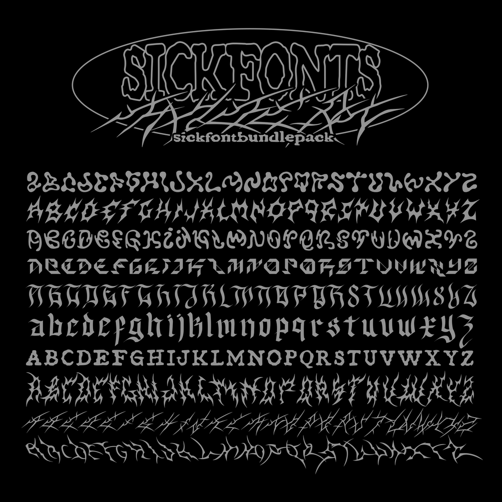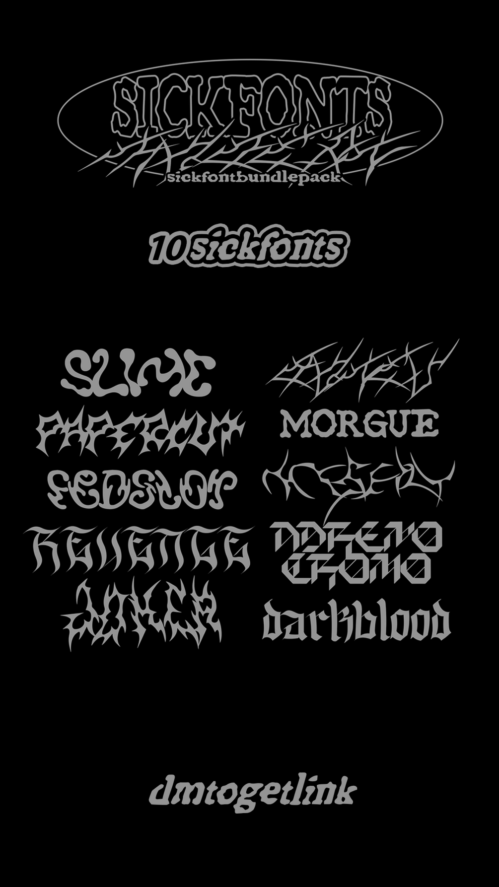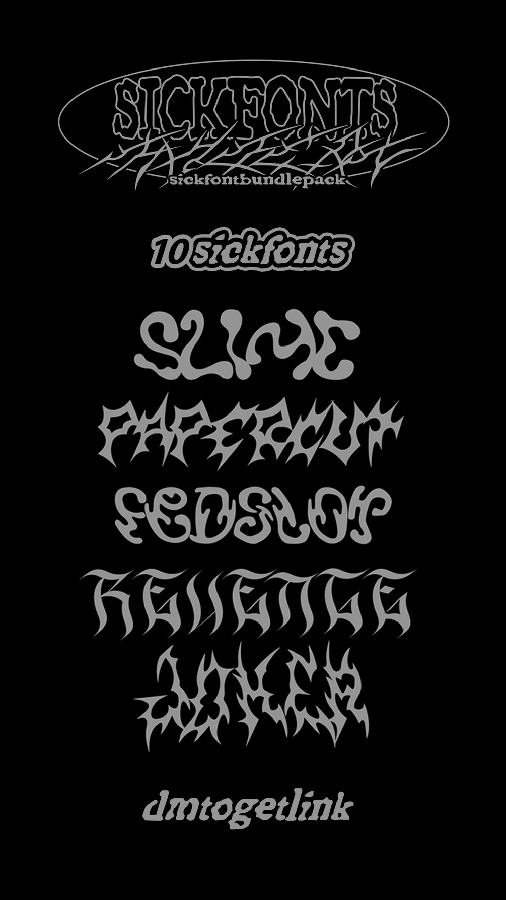 SICK FONT BUNDLE 2 includes: 10 display fonts PERFECT for big names or titles, logos and branding, clothing and posters or artworks!! creatives fonts of several styles such as TRASH, CALLIGRAPHY, SLIMEY, GOTHIC, EXPERIMENTAL!